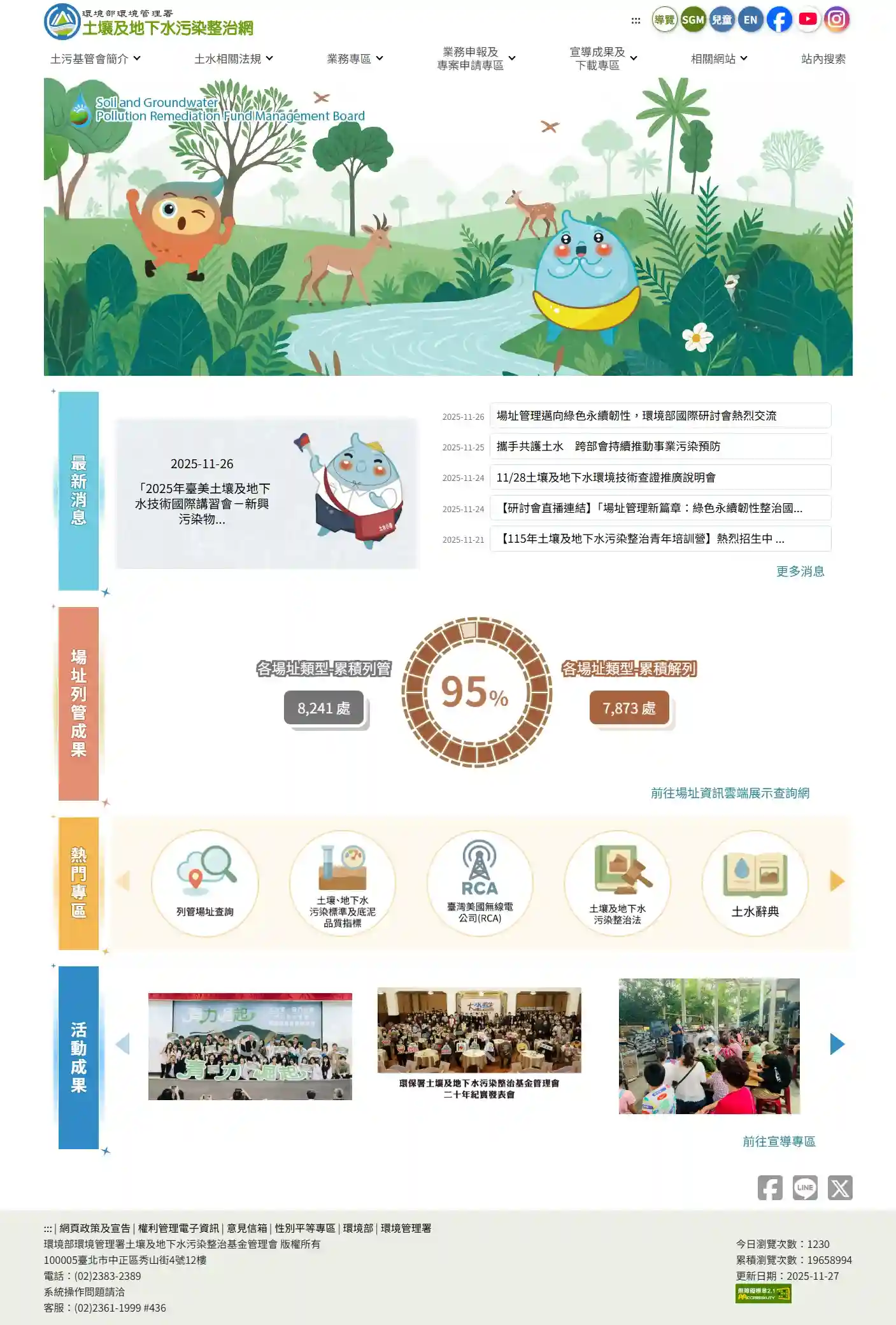 提供民眾完整瞭解土污基管會業務執掌、相關法令規章以及各項土水業務執行成果。同時也提供土地品質查詢、影音專區與便民服務等多個重要資訊主題。