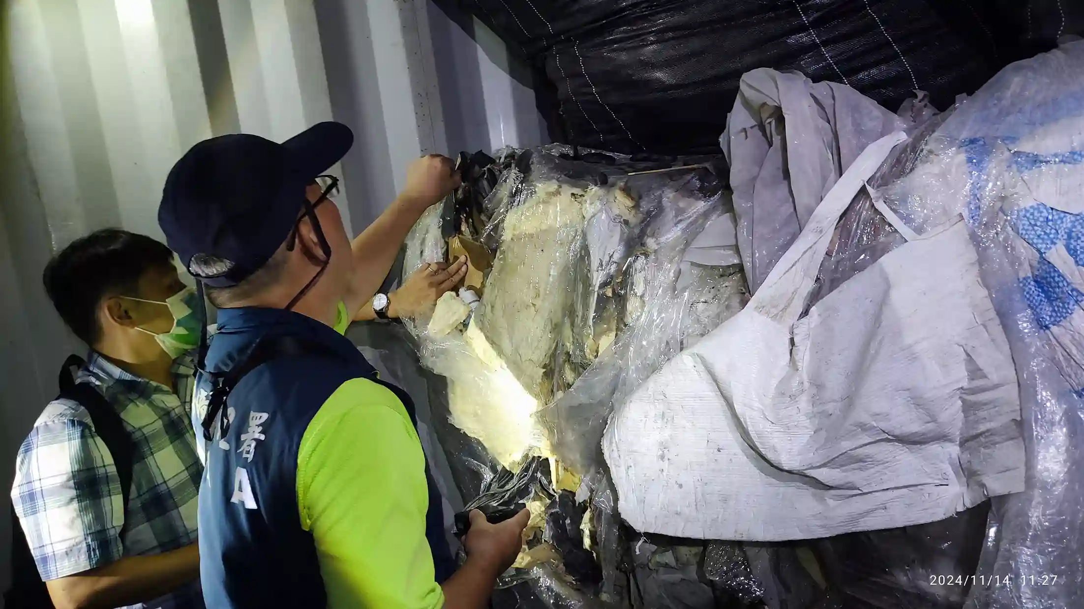本署中區環境管理中心於 112 下半年起至 113 年間多次接獲關務署臺中關通報疑似出口廢棄物案件,經開櫃查驗多屬廢塑膠混合物,經深入研析後發現有多家互相關聯之公司,惡意以塑膠原料名義非法輸出廢塑膠混合物至國外,本署中區環境管理中心及臺中市環保局遂聯合臺中關報請臺中地檢署指揮偵辦,由檢察官於 113 年 11 月 1 日指揮相關機關偕同本署中區環境管理中心及臺中市環保局執行搜索查緝,查獲不法集團業者,以合法掩護非法,將非法收受廢塑膠混合物堆放於再利用機構廠房,再以產品名義伺機闖關,業者裝櫃輸出時,還刻意將廢棄物堆置貨櫃後段,前段以乾淨物料當掩護,藉以規避相關查驗。