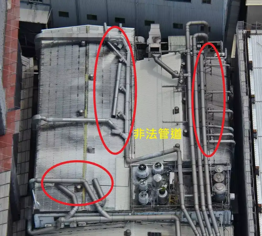 本署中區環境管理中心透過智慧勾稽區域智慧空品感測物聯網 (AIoT) 及環保系統申報資料等大數據分析,掌握到該公司未依製程實際使用有機溶劑數量申報,蓄意短繳空氣污染防制費之違法情形,後續再運用無人飛行載具及紅外線氣體顯像儀等科技工具監控,發現該公司於廠房頂設置多處非法排放管道,將未經處理之含甲苯、二甲苯之揮發性有機物廢氣逕行排放到大氣中,嚴重影響空氣品質。