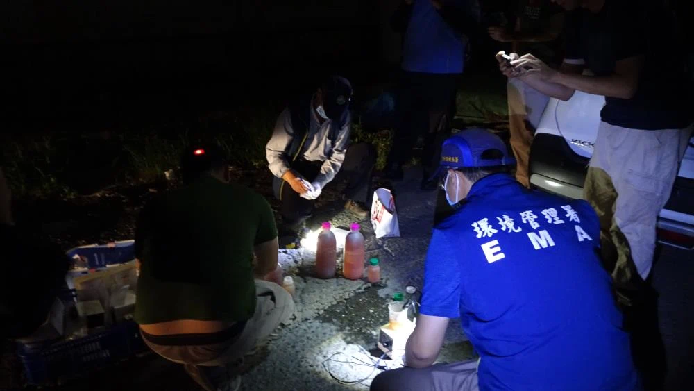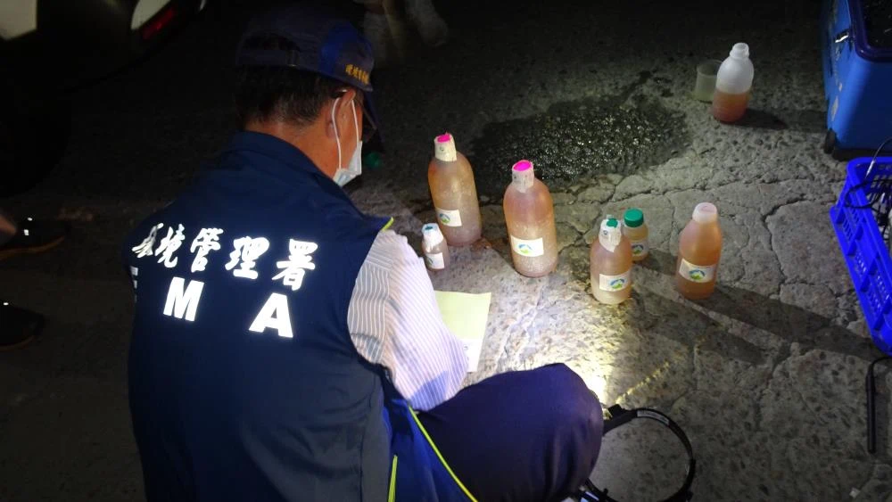 然而夜間監控數據仍持續異常,本署督察人員遂於夜間埋伏查察,果然發現該廠放流口正排放黃褐色高濃度廢水。採樣過程中,廠內人員察覺後急喊「趕快關水」,但督察人員已完成取樣。經檢驗結果顯示,該廠廢水懸浮固體(SS)濃度超標 11 倍,確認違反《水污染防治法》第 7 條規定。