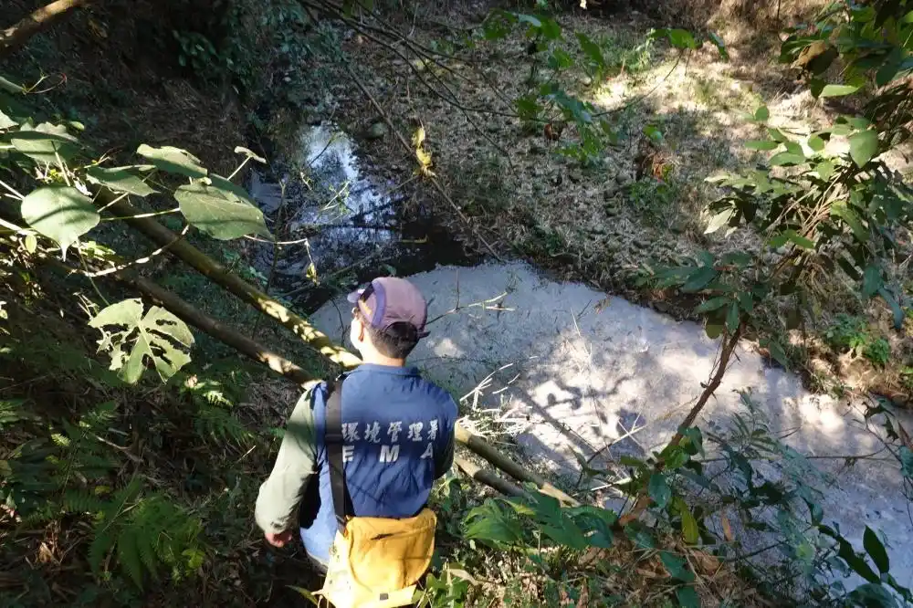 督察人員涉溪穿越竹林至畜牧場圍牆邊坡,發現暗管口正排放未處理廢水,隨即採樣送驗並以空拍機蒐證。現場畜牧場人員見督察人員進場後,急忙調整排水流向以規避查核;督察人員隨即於廢水處理區投放追蹤劑,成功證實該追蹤液體自暗管流出場外進入二仁溪,確認其違規偷排行為。